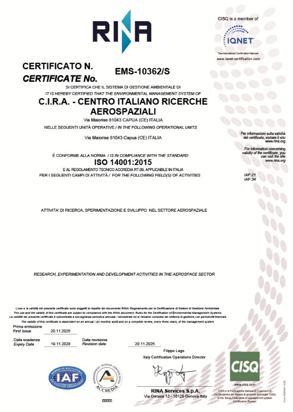 - miglioramento dell’immagine aziendale e della sostenibilità: la certificazione ISO 14001 rappresenta per il CIRA un elemento distintivo nei confronti di clienti, partner, ecc., facilitando la qualifica come fornitore e rafforzando la credibilità aziendale in ambito sostenibilità;